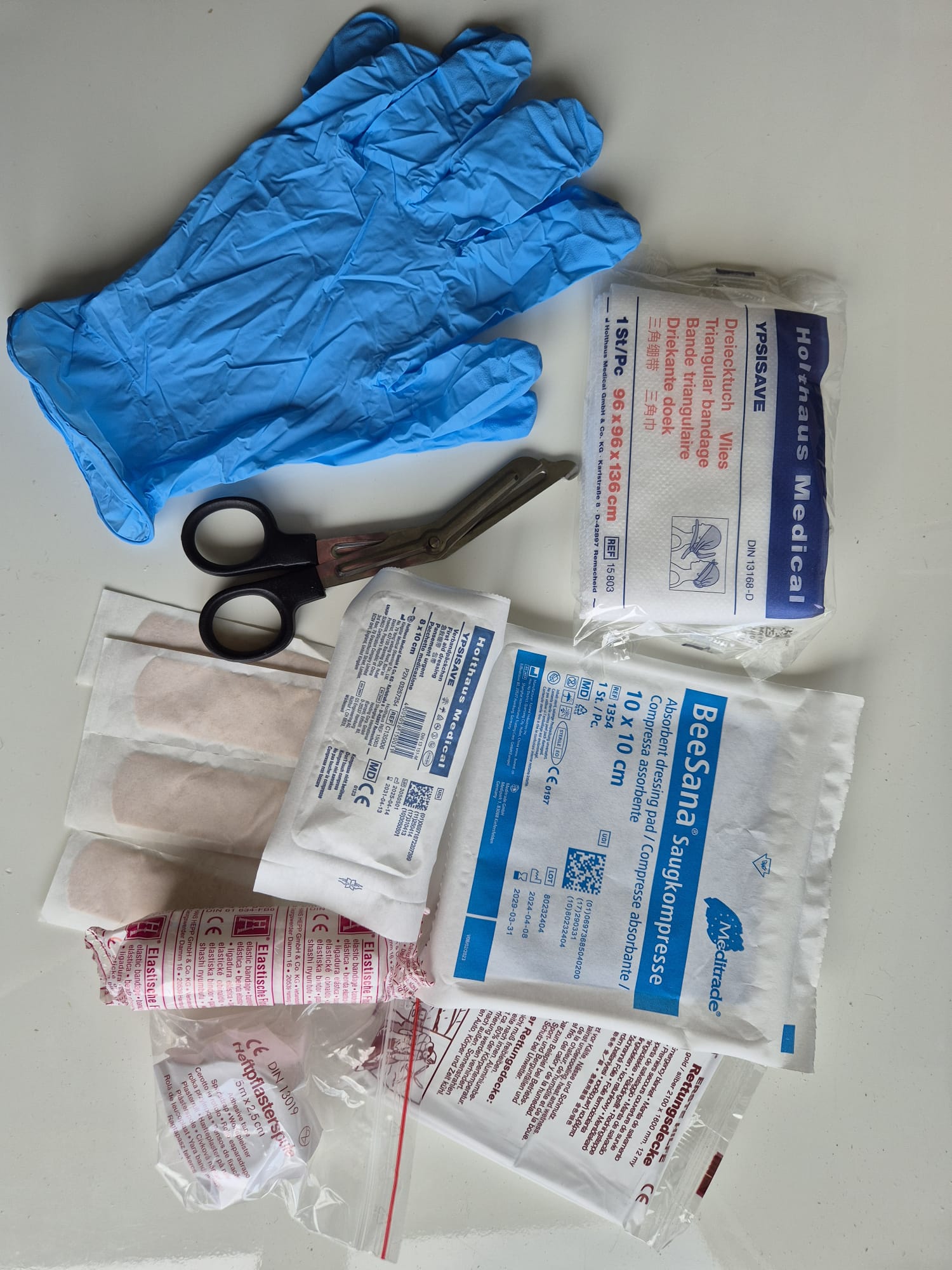 Dreiecktuch, Rettungsdecke, Verbandspäckchen mittel, Fixierbinde 4 m x 8 cm, Saugkompresse 10 x 10 cm, Erste Hilfe Schere mit Kunststoffgriff, Heftpflaster in Beutel 5 m x 2,5 cm, 5 Pflasterstrips einzeln verpackt, 2 Paar Nitril Einmal Handschuhe
