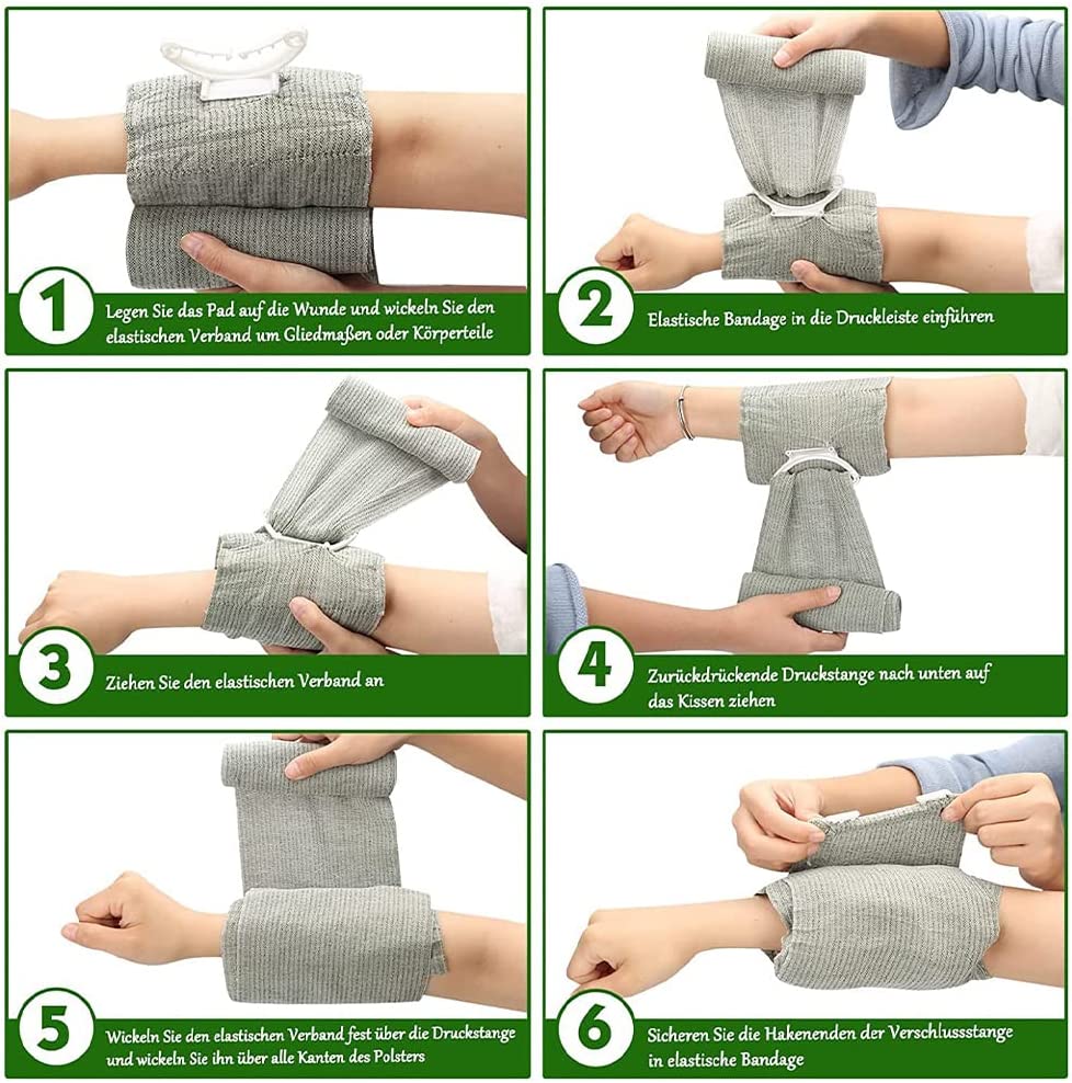 Das sterile, nicht haftende Pad der Notfallbandage übt Druck auf jede Stelle aus, wickelt und sichert sich leicht und hat eine zusätzliche Anwendung ähnlich einem Tourniquet, um den Blutfluss weiter einzuschränken.